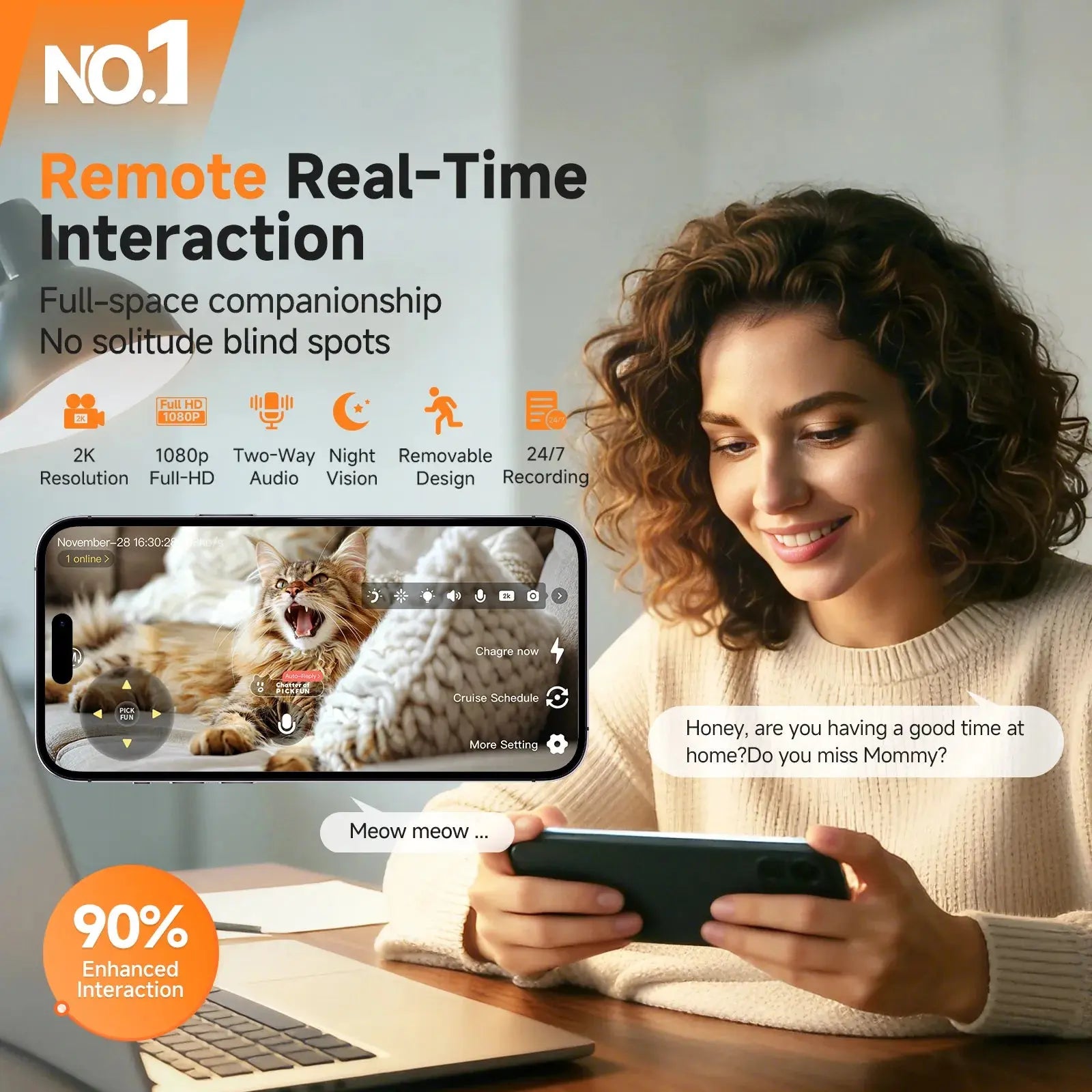 Real-time high-definition monitoring, video recording, and playback functions, combined with black and white and full-color night vision capabilities, ensure you don't miss any details of your cat or dog, day or night. -