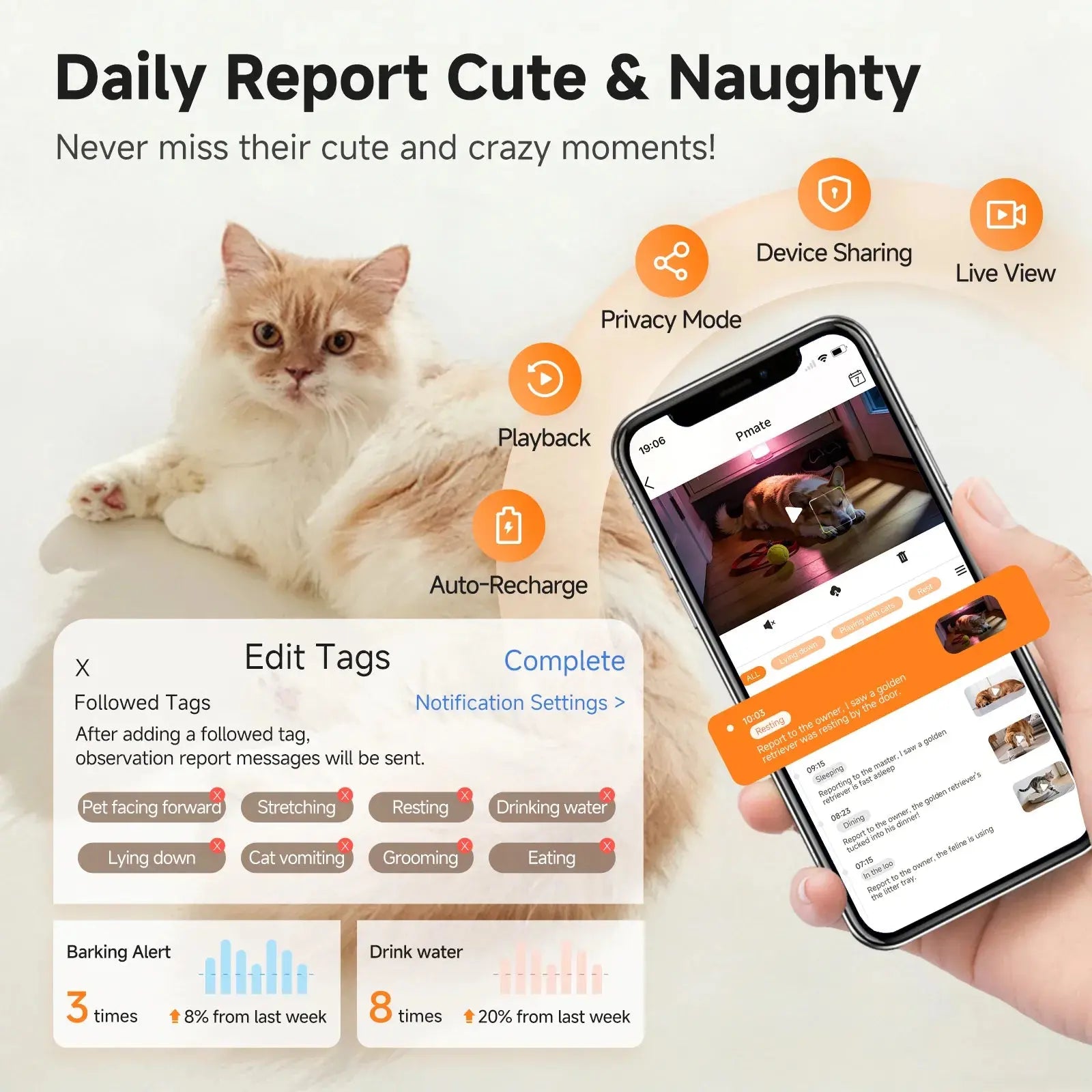 Automatically records and analyzes your cat or dog's activity trajectory and behavior patterns, helping you better understand their emotions and health status for more scientific and reassuring pet care. -