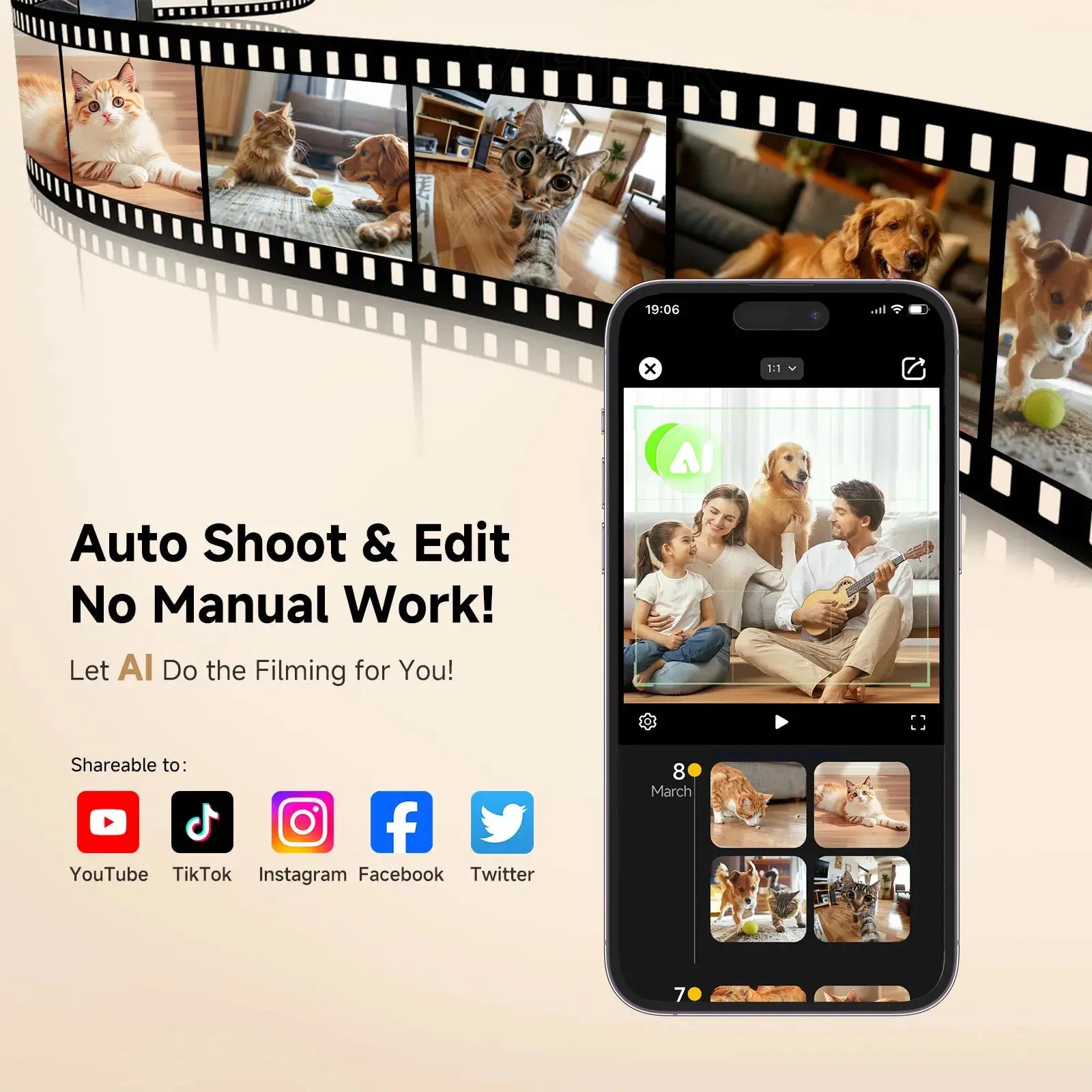 Built-in AI automatic editing and beautification allow for one-click generation of fun short videos and photos, requiring no professional skills, so you can easily share your cat or dog's wonderful daily life. -